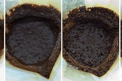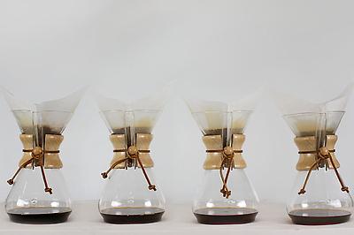 These four Chemexes have been brewed using the same amount of grounds, water and temperature. The only thing different between them is the grind. They all look about the same color, but their taste is very different. If you look at the used filter you can see the evidence in the grounds. A too-fine grind will leave a thick sludge in your filter. Water has moved through the fine grounds at a slow drip and the resulting coffee is over-extracted and bitter. Even when watered down, the bitter flavor remains so watch out for the sludge.
