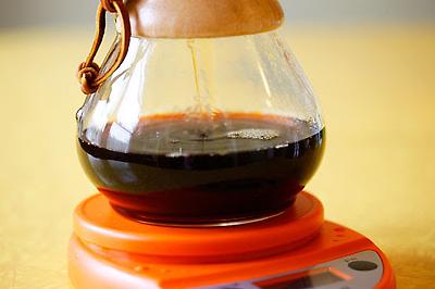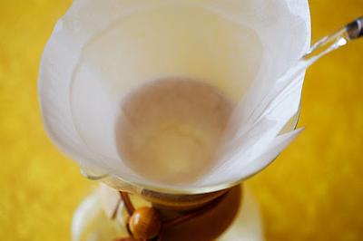 Measure about 285g (on the scale) or 10oz of water into your kettle and set it to boil. Once the kettle has finished boiling let it stand for about one minute. Pour some water into the Chemex, saturating the filter to seal it in place and rinse away any papery taste. This water also pre-heats the Chemex for making hot coffee. Be sure to pour the pre-brew water our of the Chemex before placing the grounds in the filter. Your Chemex will be hot, so be sure to hold the wooden filter instead of the glass.
