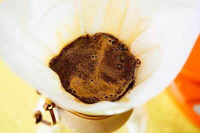 Put your freshly-ground coffee into the filter, and shake gently to level. Take your boiled water and pour enough water to wet the grounds. You will notice the coffee “bloom” up into a dome and then slowly recede after 30 seconds. A healthy "bloom" indicates fresh beans, and is important to ensuring an even brew.