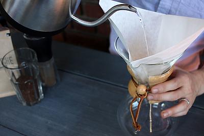 Using boiled water like you would with a normal Chemex, wet the grounds from the center out to the edge without reaching your filter, pausing to let the grounds bloom. When the dome of grounds has deflated, continue pouring in a spiral, using about 1/3 of your water at a time.