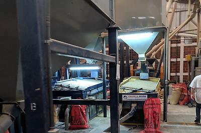 The mill is where the most intensive quality control takes place to ensure that only the best beans are exported. Each lot of coffee is loaded into a hopper and fed through the production line. First, the parchment is removed and the green beans are passed through a de-stoner, which filters out any rocks or debris that may have mixed in with the coffee during processing.