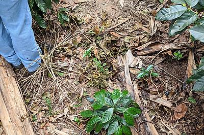 At the first farm we visited, we learned about how some coffee farmers are adapting to fluctuating coffee prices. Many farmers have started planting secondary crops like bananas to have supplementary income when coffee yields or prices are low, and this farmer discovered an additional benefit. When segments of banana tree are cut and left between young coffee plants, the banana tree segments leech their water into the soil, which gives the coffee plants an added boost without additional irrigation.